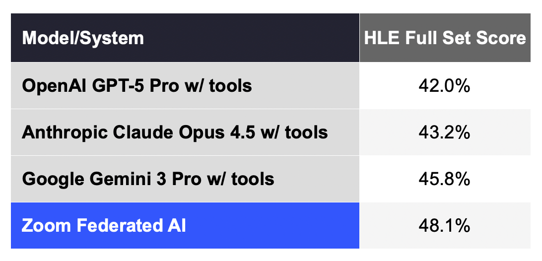 Zoom says its AI hit 48.1% on the full-set Humanity’s Last Exam (HLE), beating the prior best they cite (45.8% from Gemini 3 Pro with tool integration) by 2.3 points.
