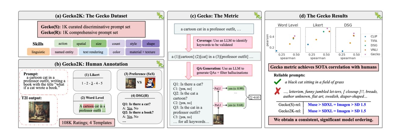 Google DeepMind introduces "Gecko," a rigorous benchmark for evaluating text-to-image AI models. Current evaluation methods lack comprehensiveness and reliability, prompting the need for Gecko. It assesses models across 2,000 text prompts, categorizing skills and complexity levels. Gecko gathers extensive human ratings to discern model limitations, ambiguous prompts, and evaluation inconsistencies.