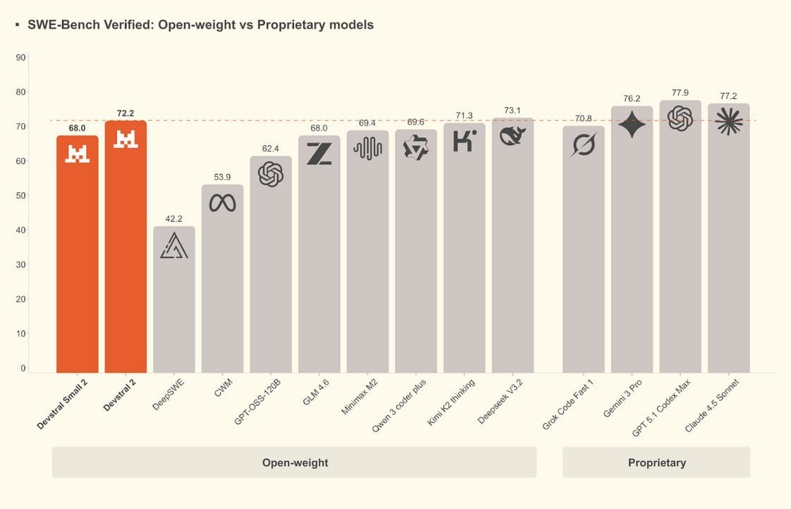 On benchmarks, Devstral 2 hits 72.2% on SWE-bench Verified—a tough coding benchmark based on real GitHub issues—and Mistral claims it’s up to 7x more cost-efficient than Claude Sonnet on real-world tasks, while still trailing top closed models in overall quality. Devstral Small 2 reaches 68.0% on the same benchmark and is designed to run locally on consumer-grade GPUs or even CPU-only setups, which is a big deal for indie devs and smaller teams.