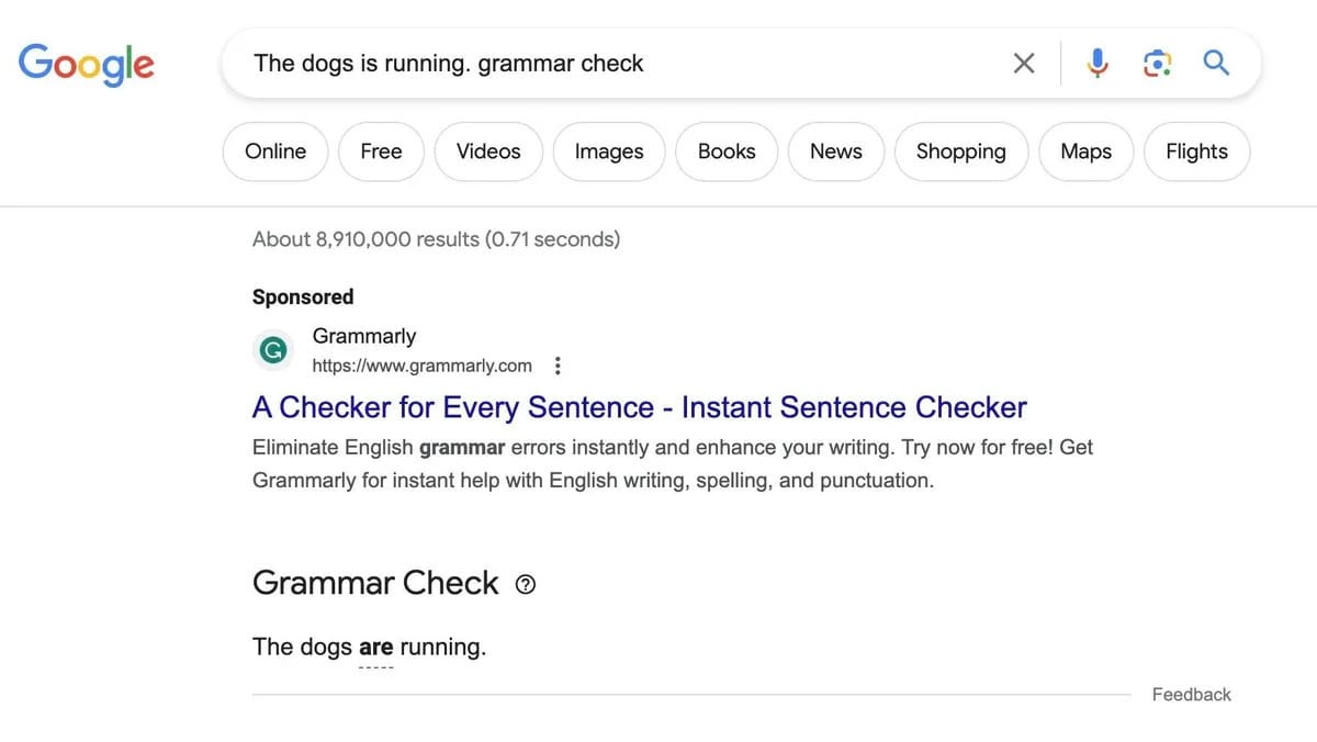 Want to give it a go? Type your sentence in the search bar and toss "grammar check" at the end. If Google spots a mistake, you'll see bold and underlines. No errors? You'll get a green check. Copying the fixed sentence is a breeze — just hover and click "COPY". We tested it out and, no shocker, it's not perfect. Like with the sentence "The dogs aren't outside today it is too hot," Google suggested a comma, but that ain't right. Got feedback? There's a button for that.